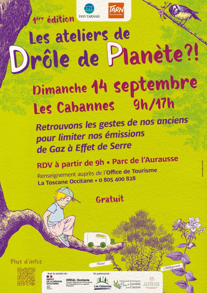 Un événement organisé en partenariat avec la Mairie Les Cabannes, la Communauté de Communes du Cordais et du Causse, l’Office de Tourisme « La Toscane Occitane » dans le cadre du nouveau programme annuel et départemental d’événements d’Éducation à l’Environnement et au Développement Durable (EEDD) « Drôle de Planète » édition 2025.